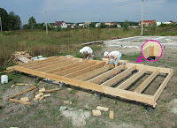 По окончанию нелёгкой борьбы с песчаным грунтом (бур, почему–то никак не хотел вгрызаться в песок и приходилось прилагать существенные усилия для его продвижения вниз), в центры лунок забиты метровые прутки арматуры ∅12 (на глубину около 10 см; в мае планировались прутки потоньше и подлиннее), скручены из рубероида трубы по размерам лунок и вставлены в эти лунки (левая нижняя фотография). Затем, по водяному уровню (обязательно буду покупать лазерный нивелир!) была выставлена высота столбиков над уровнем земли (около 20 см) и дополнительными полосами рубероида, перетянутыми вязальной проволокой, рубероидная опалубка наращивалась до требуемого уровня (на средней фотографии — ниткой обозначен требуемый уровень и рубероидные надставки). Общий вид свайного поля представлен на правой нижней фотографии.